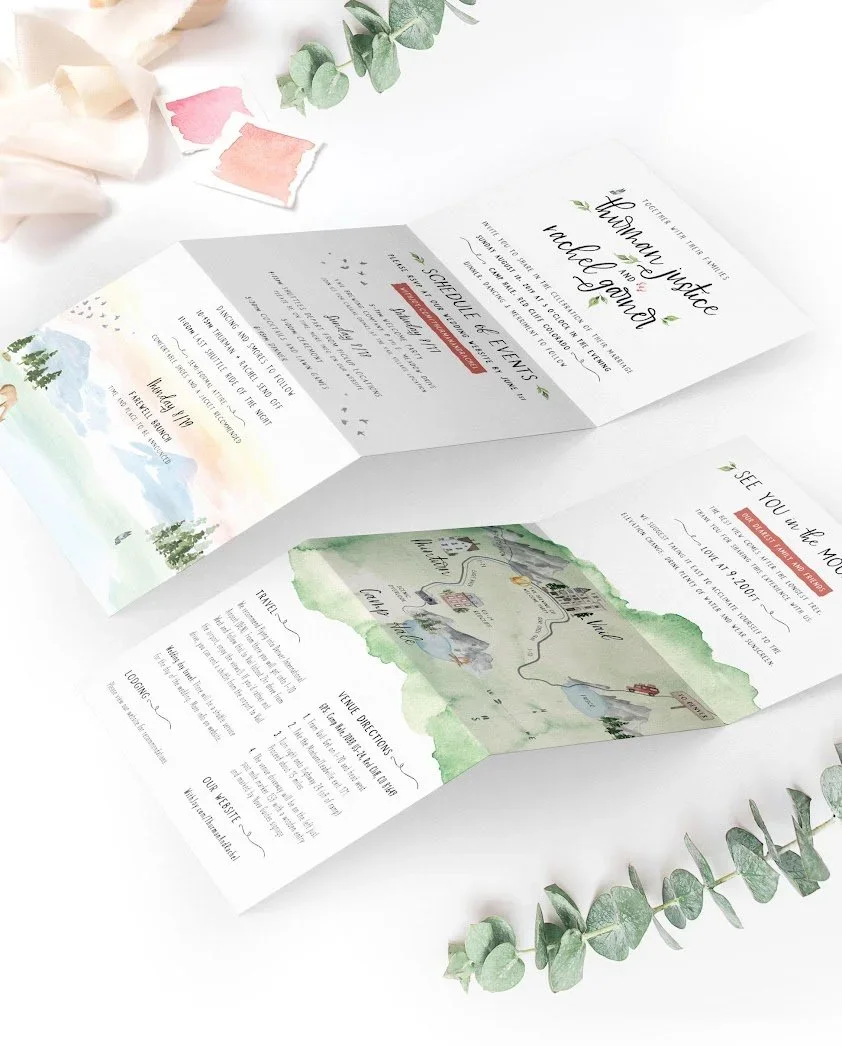 “As creatives, we loved dreaming up our own invitation suite and exploring ways to push the boundaries. One of our favorite details was the custom trifold design—it captured the spirit of our weekend celebration perfectly. It felt practical, beautiful, and gave our guests the wow-factor and sense of adventure we hoped to create from the moment they opened it.”