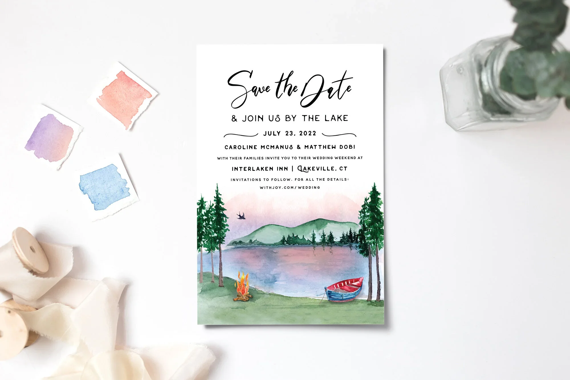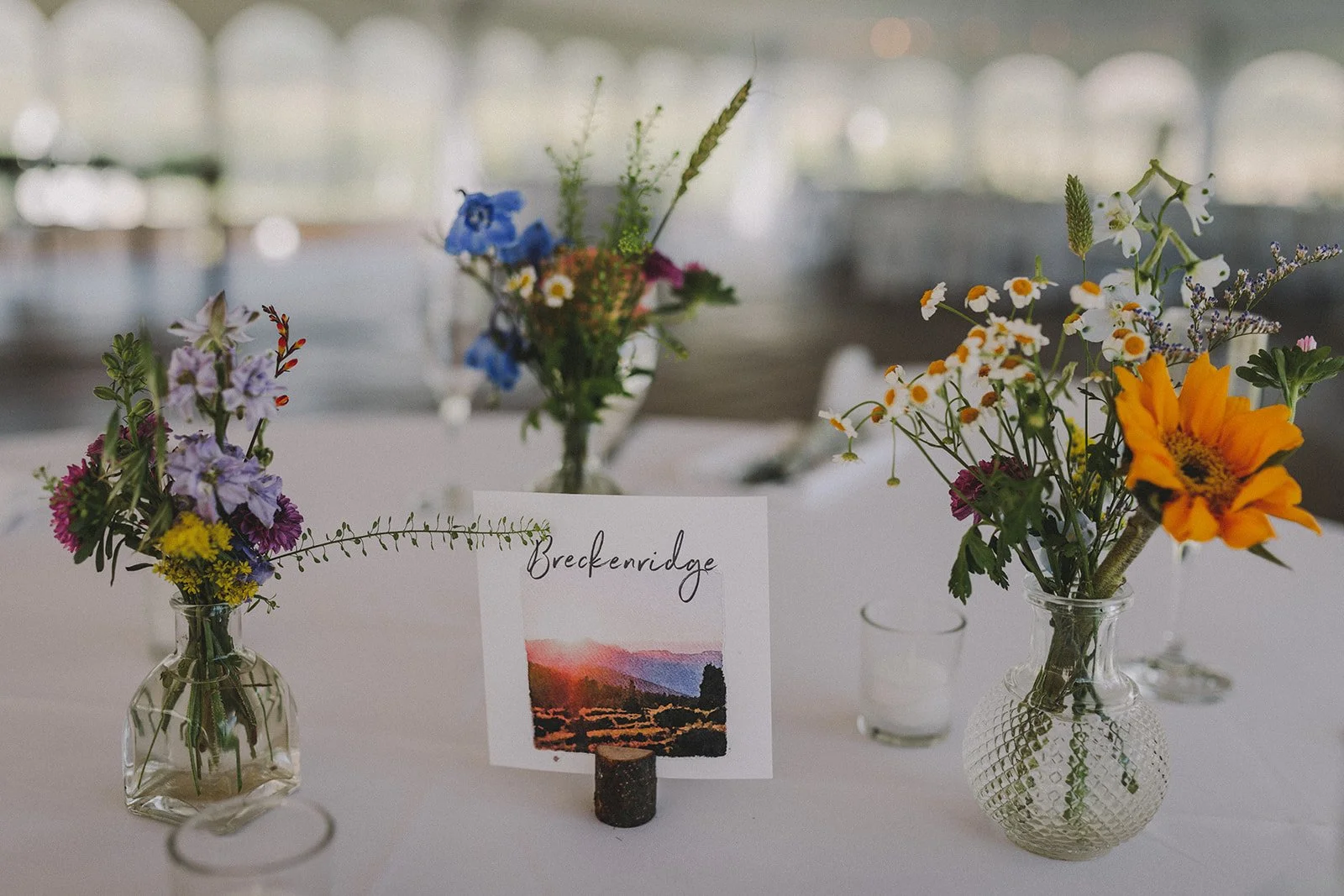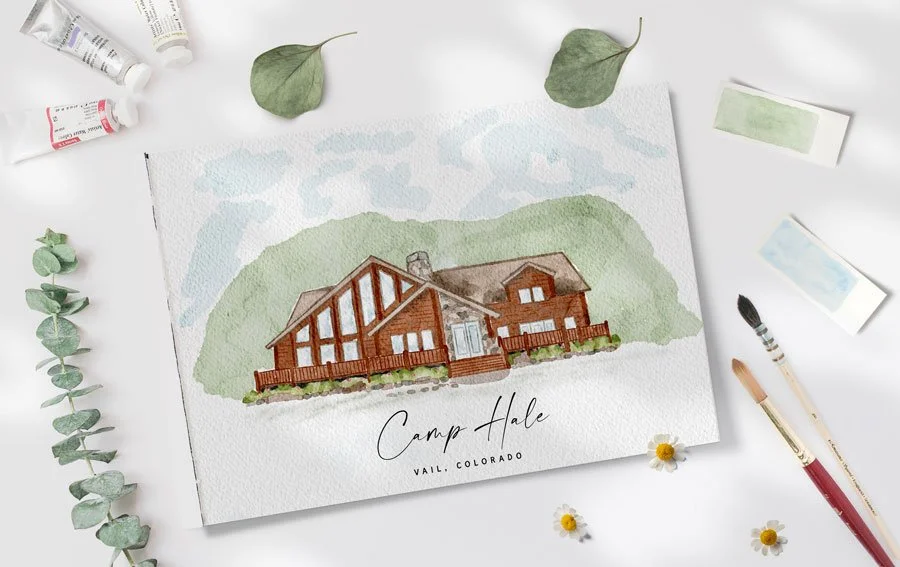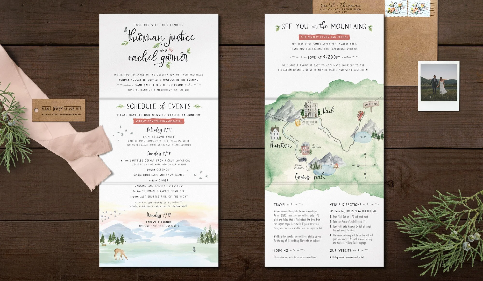 A bespoke custom watercolor illustration of Camp Hale was created to reflect the natural beauty of the setting, weaving the landscape into the paper goods for a deeply personal touch.